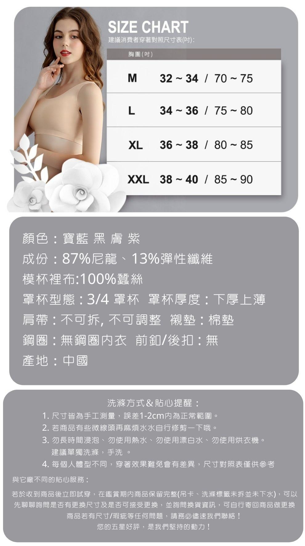 ◆建議消費者穿著對照尺寸表(吋):請依胸圍罩杯選擇